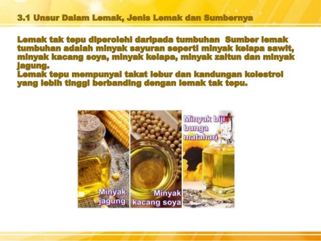 Apr 06 2020 Lemak haiwan mentega Lemak tumbuhan marjerin bunga matahari kelapa sawit dan minyak zaitun Keadaan pepejal pada suhu Cecair pada suhu bilik. Sungguhpun lemak tepu dan lemak transfat meningkatkan LDL lemak transfat merendahkan HDL. Contoh lemak haiwan adalah lemak minyak ikan mentega dan minyak sapi.