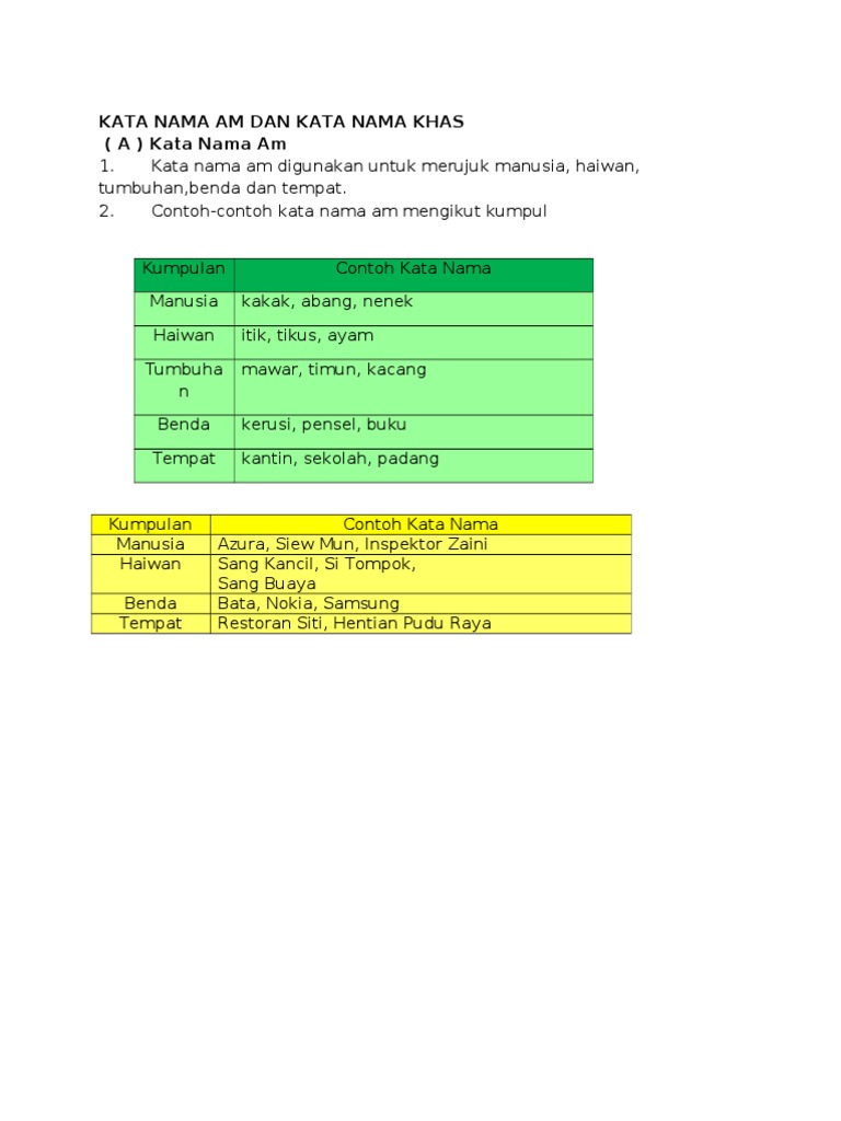 Pemimpin Perenggan 2 baris 1 suruhanjaya Perenggan 4 baris 1 tahun Perenggan 3 baris 2 negeri Perenggan 1 baris 3. A taman b sofa c nasi d pasir e basikal f kereta 4 Kata nama am bagi benda. 1 Antara berikut yang manakah kata nama Khas a sekolah b Hospital Sungai Buloh c kedai d jambatan 2 Berikut ialah kata Nama Khas bagi manusia kecuali a Cikgu Ali b Puan Khatijah c doktor d Doktor Aqeel 3 Kata Nama Khas terbahagi kepada dua iaitu a Hidup dan Tidak Hidup b Tumbuhan dan Haiwan c Manusia dan Patung d Pokok dan Alam 4 Contoh Kata Nama Khas bagi haiwan ialah a harimau b Pak Belang c kucing d arnab 5 Kata Nama Khas.