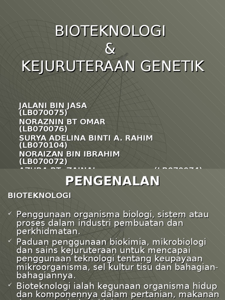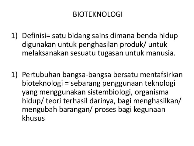 Frontliners merupakan individu yang amat penting waktu waktu ini. BIOTEKNOLOGI DALAM PERTANIAN Pengertian Bioteknologi Aplikasi prinsip sains dan kejuruteraan dalam pemprosesan bahan oleh agen biologi untuk menghasilkan barangan dan perkhidmatan bagi keperluan manusia. Bioteknologi emang nyiptain makhluk hidup dari makhluk hidup yang ada.