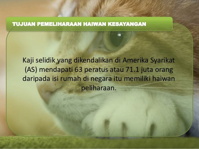 Aug 05 2014 TUJUAN PEMELIHARAAN HAIWAN KESAYANGAN Kaji selidik yang dikendalikan di Amerika Syarikat AS mendapati 63 peratus atau 711 juta orang daripada isi rumah di negara itu memiliki haiwan peliharaan. Bertentangan dengan hak subjektif orang lain. Memang tidak luput dari hewan peliharaan sudah pasti mereka akan memelihara satu atau bahkan lebih hewan dari yang biasa saja sampai yang buas.